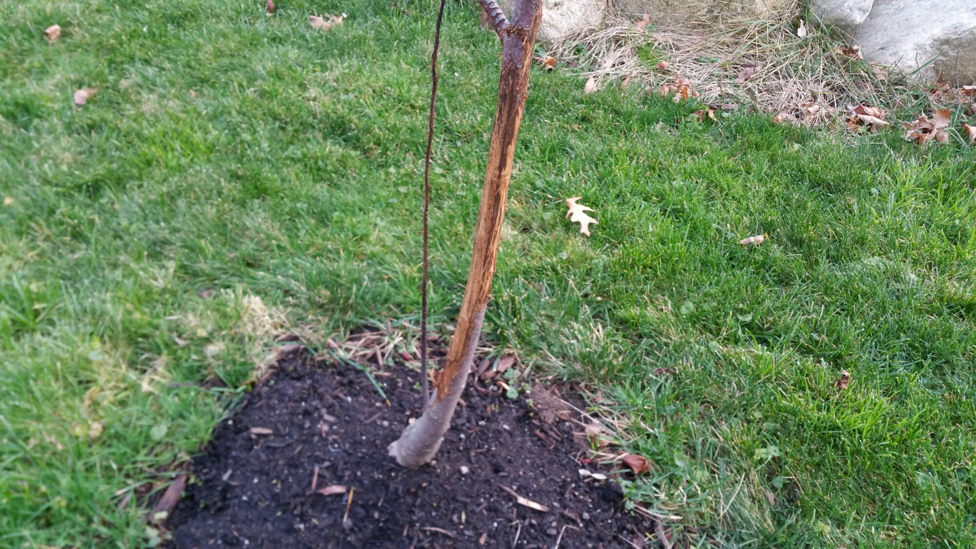 When this happens it called girdling. Girdling is when the bark has been scraped away all the way around the trunk. This is a death sentence for tree’s.